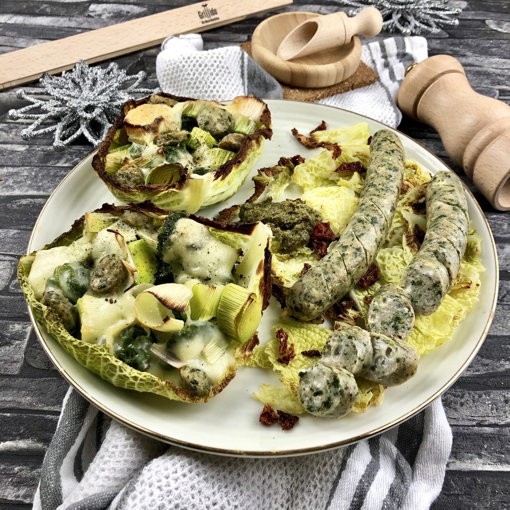 Diese in eine Auflaufform „setzen“, damit man sie besser befüllen kann. Den restlichen Wirsing kann man in feine Streifen schneiden, würzen und ebenfalls mit in den Ofen geben.